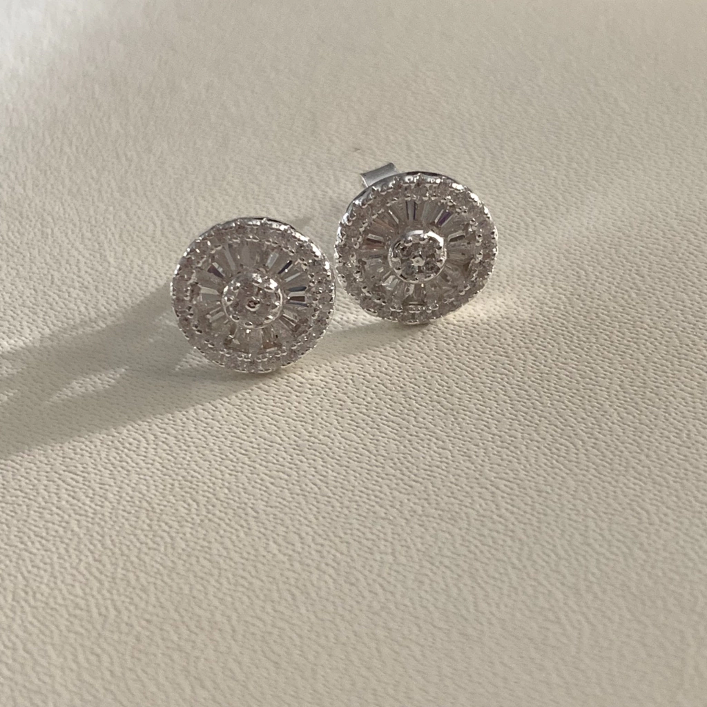 Brinco totalmente confeccionado em prata 925, cravejado de zircônias incolores em formato pizza.